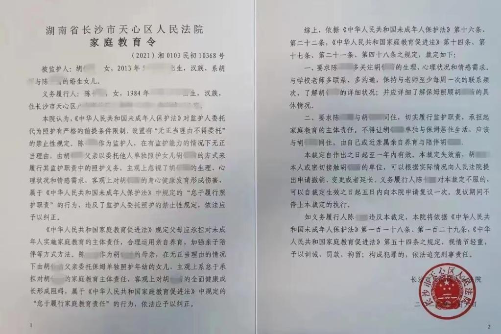 长沙市天心区人民法院发出的家庭教育令。