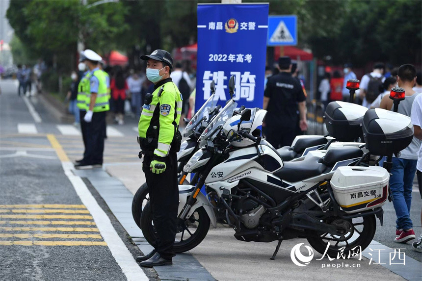 江西某考点前,交警“铁骑”在考点周边维持交通秩序。人民网 时雨摄
