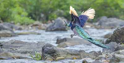 恐龙河自然保护区内的绿孔雀展翅飞翔。