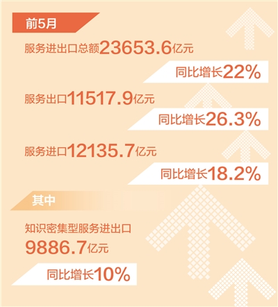 知识密集型服务贸易稳定增长。前5月,知识密集型服务进出口9886.7亿元,同比增长10%。其中,知识密集型服务出口5602.4亿元,增长13.6%;出口增长较快的领域是电信计算机和信息服务、其他商业服务,分别增长18.5%、13.2%。知识密集型服务进口4284.3亿元,增长5.6%;进口增长较快的领域是保险服务,增速达74.2%。