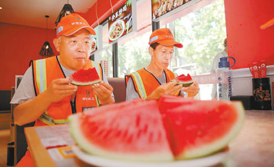 石家庄市桥西区,环卫职工正在“爱心驿站”里吃西瓜解暑。