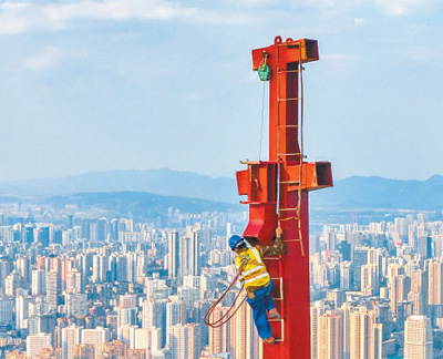 施工人员在重庆陆海国际中心项目主塔楼楼顶进行施工作业。