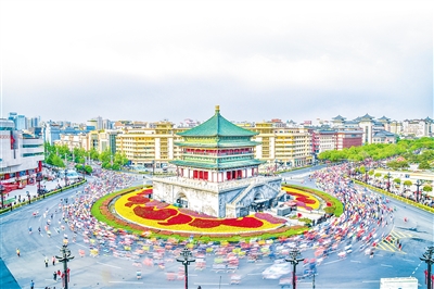 西安国际马拉松参赛选手跑过西安钟楼。在建设世界赛事名城过程中,西安国际马拉松和西安城墙国际马拉松等赛事品质近年来持续提升。