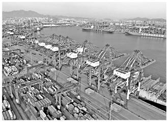 海关最新统计显示,一季度,我国货物贸易进出口总值9.89万亿元,同比增长4.8%。我国外贸开局平稳,呈现逐月向好态势。图为近日数十艘货轮在青岛港前湾联合集装箱码头装卸货物。 本报通讯员 张进刚 摄