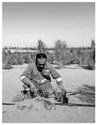 图为阿克苏地区的护林员在沙漠检查滴灌线路。