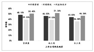 珠三角地区企业环境责任信息披露指数平均分为42.59,京津冀地区为42.24,长三角地区为36.61(总平均分为39.89)。从一级指标得分率来看,三地区得分率相近;其中京津冀地区企业环境管理、环境绩效两个一级指标得分率最高,分别为48.10%、39.33%;珠三角地区企业的利益相关方指标得分率最高,为51.36%。