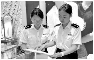 图为海口海关所属三亚海关关员在三亚海旅免税城进行免税品盘点。 本报记者 翟小功 摄
