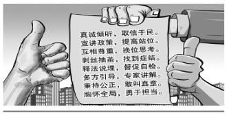 真诚倾听,取信于民。宣讲政策,提高站位。互相尊重,换位思考。剥丝抽茧,找到症结。释法说理,督促自检。多方引导,专家讲解。秉持公正,敢叫真章。胸怀全局,勇于担当。