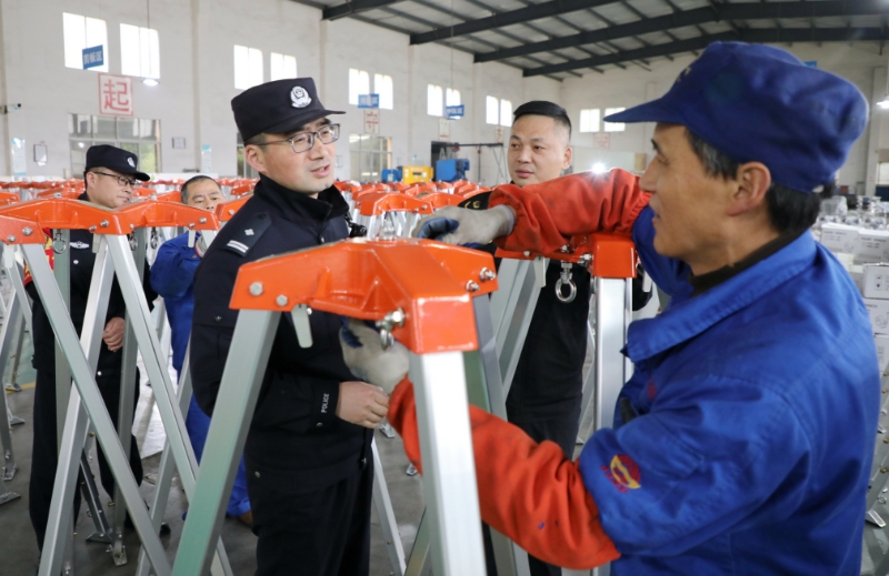 近日,江西省九江市公安局濂溪分局虞家河派出所民警辅警联合市场监管部门人员深入辖区企业进行走访和开展安全生产隐患排查,了解企业需求,并征求员工意见建议。图为民警辅警和市场监管部门人员走访企业并开展安全生产隐患排查。 本报通讯员 游建栋 摄