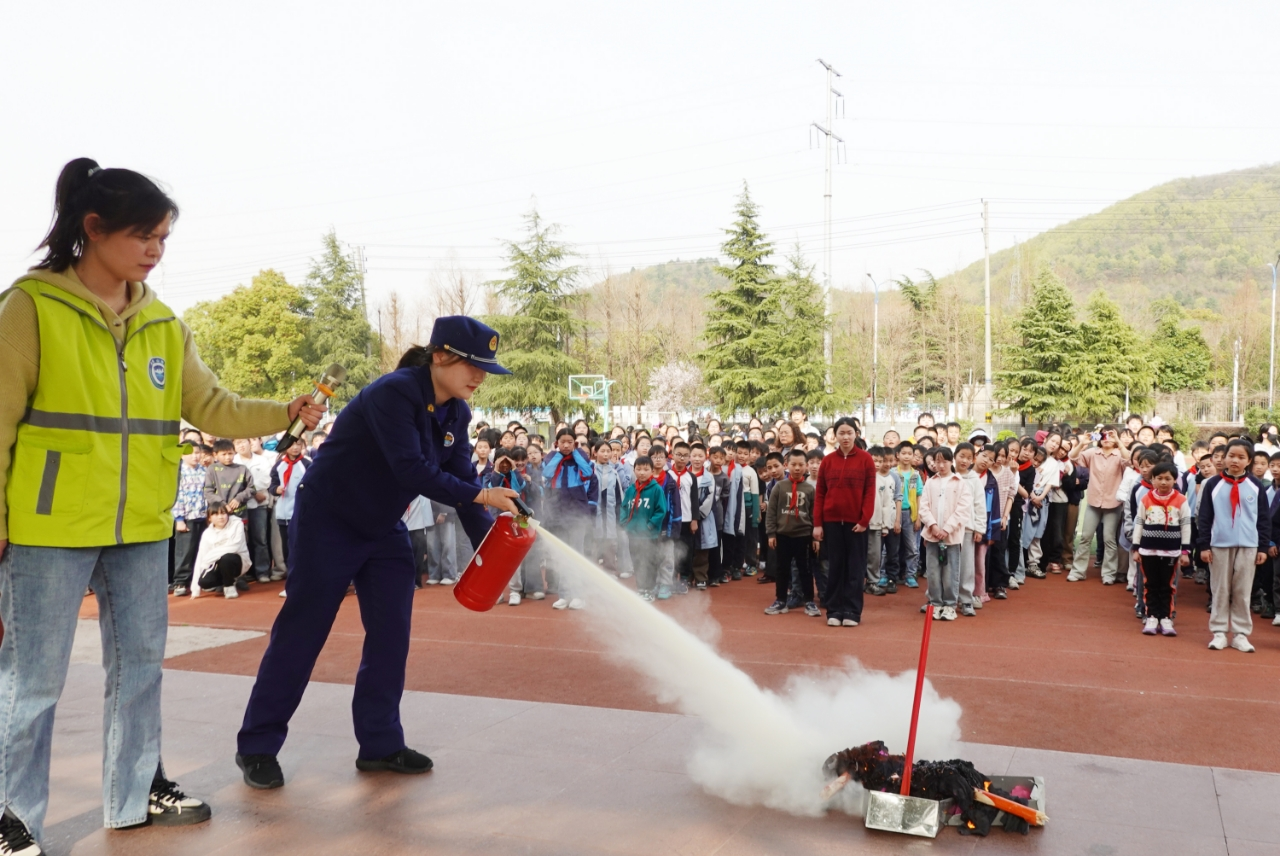 近日,安徽省马鞍山市花山区江东街道金瑞社区联合花山区消防救援局,在金瑞小学开展消防安全宣传教育活动。活动中,随着模拟火灾警报响起,全校师生迅速有序疏散至操场。消防人员现场指导,详细讲解火灾逃生技巧及灭火器使用方法。图为活动现场。 本报通讯员 胡智慧 摄