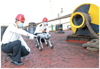 近日,南京海关所属扬州海关联合杭州宇树科技有限公司探索轮足式机器人在入出境船舶智慧查验领域应用,并首次上船尝试开展相关查验。通过深度融合人工智能与机器人技术,加快推进危化品智能识别系统与检疫处理效能评估体系建设,为实现海关业务流程优化再造、监管作业全面升级提供更多优质方案。图为海关关员在船舶甲板测试“机器狗”机动性和通过性。