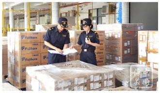 2024年5月31日,黄埔全球供应链中心开始运行。一年来,该中心通过“物流链再造+数字化监管”双轮驱动,已形成“口岸直通+属地监管”模式,为粤港澳大湾区稳链强链提供支持。图为关员监管黄埔全球供应链中心货物。 本报通讯员 傅可 摄