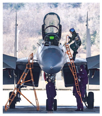 海军航空大学某基地组织飞行训练。图为飞行教官在机务人员的帮助下登上歼-15战机。 万全 摄