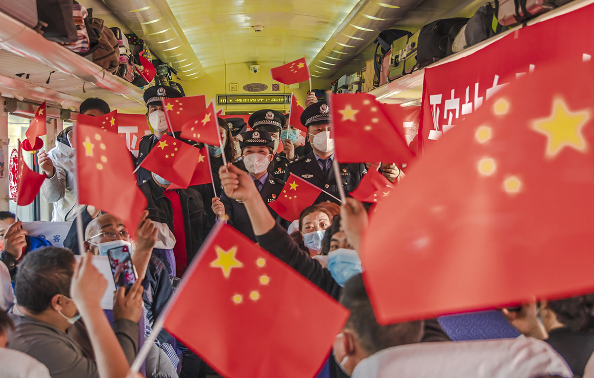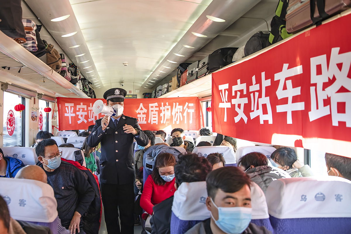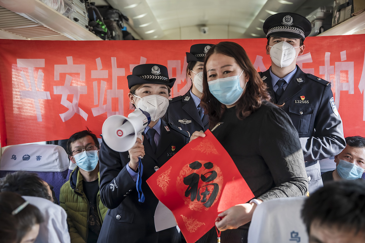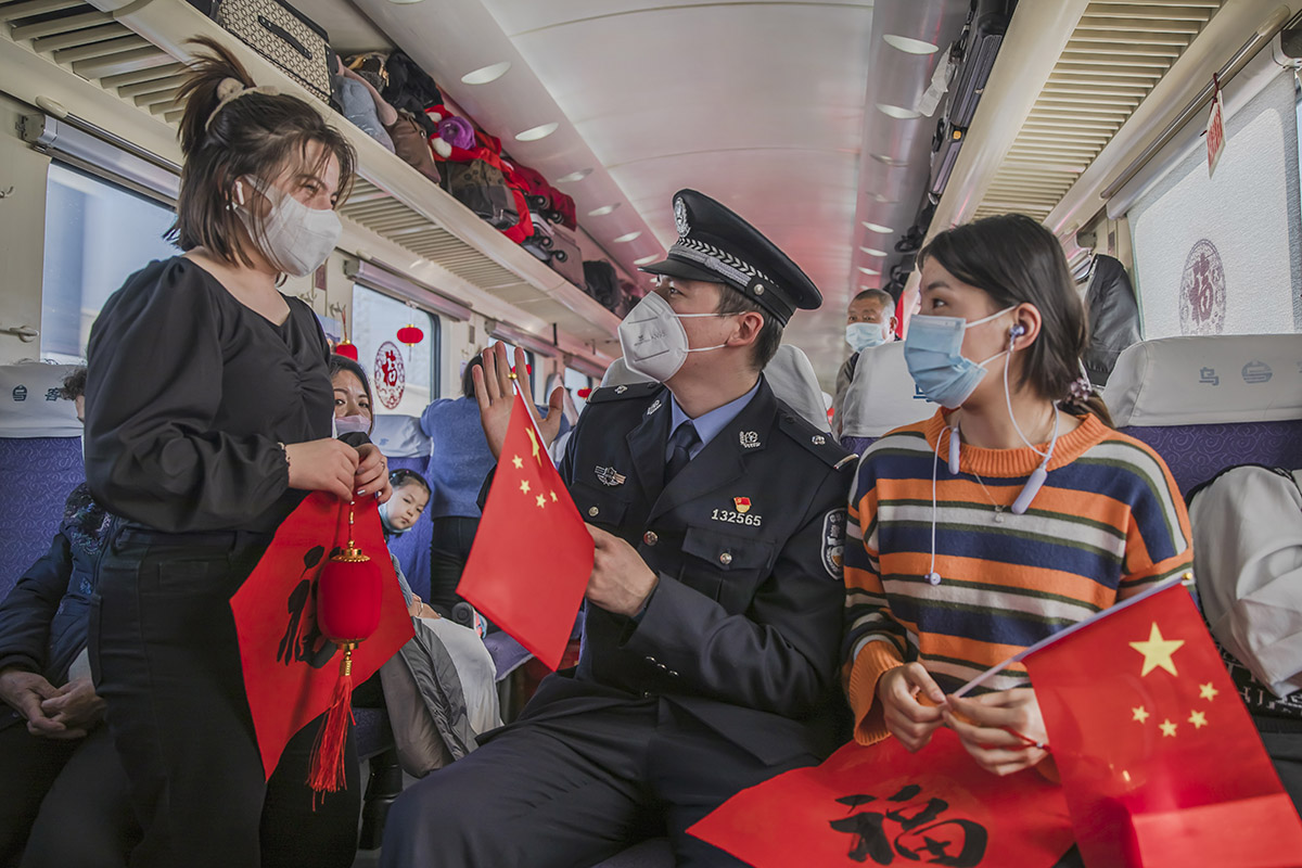 2022年全国铁路春运即将启动,为确保旅客平安出行,新疆维吾尔自治区乌鲁木齐铁路公安局乌鲁木齐公安处乘警支队专门抽调人员组成“平安站车路、金盾护你行”法治安全宣传小分队登乘各次出疆列车开展法治安全宣传活动,为广大旅客营造安全温馨的列车环境。图为1月13日,法治安全宣传小分队登上乌鲁木齐至北京西Z70次旅客列车,在车厢里开展了春运法治安全列车行系列宣传活动。乘警还与旅客互动进行安全知识竞答送红灯笼、送“褔”字,让广大旅客感受到了“年”的氛围。