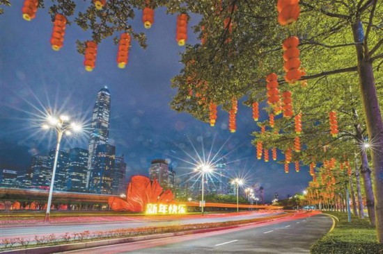 深南大道水晶岛装饰得红红火火。 深圳特区报记者 李忠 摄
