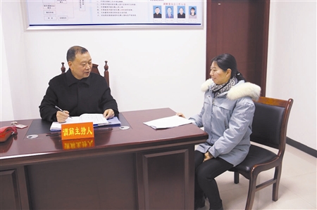 图为2022年1月5日上午,在保康法院诉前调解工作室,张仕志(左)在主持调解一件民间借贷纠纷案时向申请方了解案件基本情况。王韵婕 摄