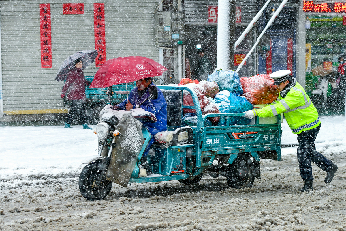 2月7日,安徽省马鞍山市和县遭遇强降雪天气,当地公安交警部门全警动员,全力疏导指挥交通,帮助受困车辆通行,确保道路交通安全有序。图为交警助力满载货物的电瓶车通行。