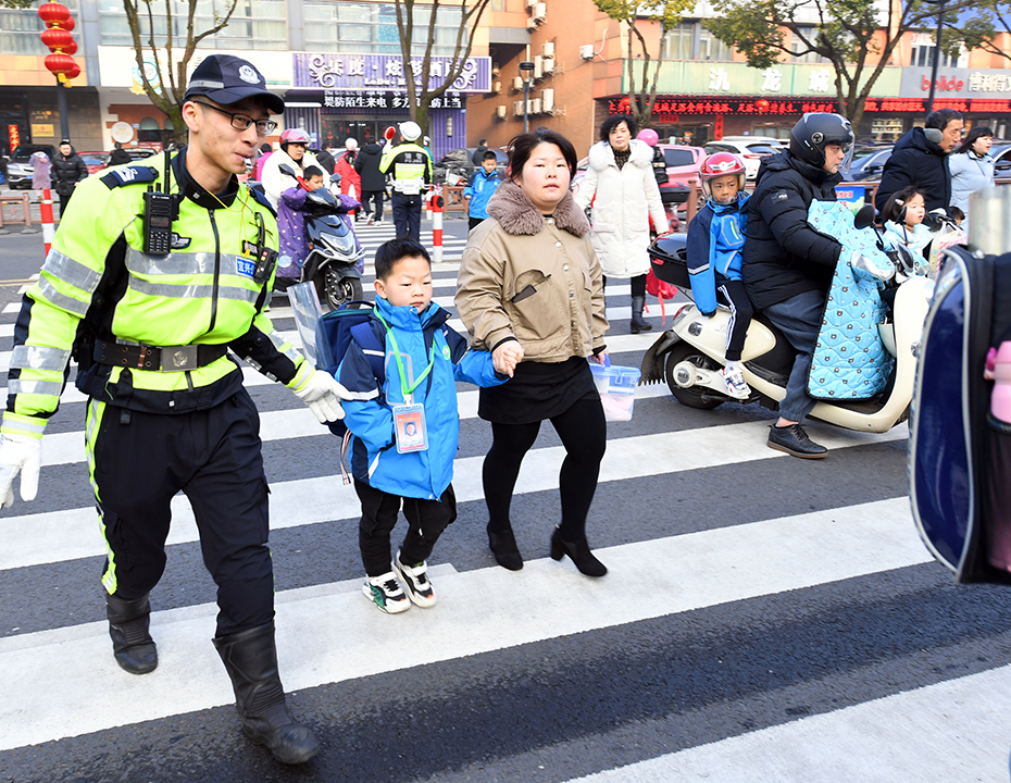 2月14日,江苏省宜兴市中小学生迎来开学第一天,宜兴市公安局按照预案,在重点路段提前部署警力,确保校园周边社会治安秩序良好、道路交通安全畅通,全力保障学生顺利开学。