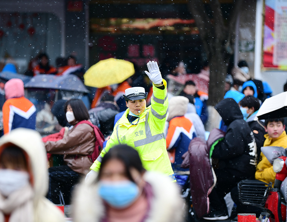 2月17日,安徽省阜南县交警冒风雪中在城区第一小学周边路段护送学生放学。连日来,该县中小学校陆续开学,阜南县公安局交管大队启动“护学岗”,疏导学校周边交通秩序,确保道路畅通和师生上下学出行安全。