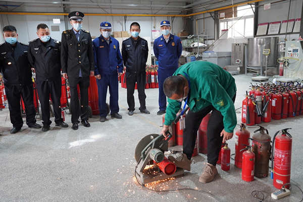 3月15日上午,北京市大兴区消防救援支队联合区市场监督管理局等职能部门,开展了“ 3·15 ”假冒伪劣消防产品集中销毁活动。工作人员对100余具不合格的灭火器以及达到使用年限需报废的灭火器进行切割销毁,防止不法商贩回收利用。