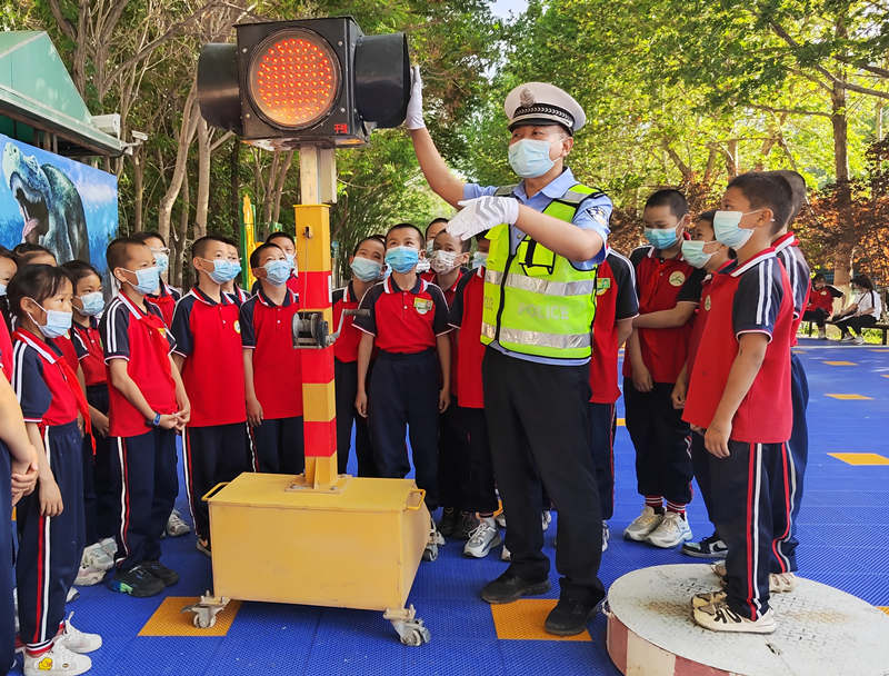 近日,新疆维吾尔自治区库尔勒市公安局交警大队天山路中队将移动式红绿灯搬进库尔勒市第二小学。在校园内的模拟“路口”,小学生们身临其境上了一堂生动有趣的交通安全课。