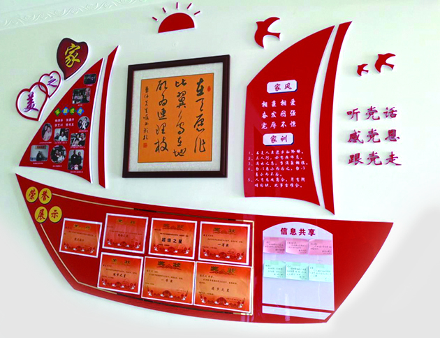 看上去,家庭文化墙似一艘正在航行的五彩帆船。心形图案的主题“家之美”三个大字,镶嵌于帆船左上角,寓意家庭幸福美满。主体则由家风家训、家庭成员、荣誉展示、信息共享和十字绣五个栏目组成。十字绣挂于船身上方正中央,其左右两边分别是家庭成员和家风家训。荣誉展示和信息共享位于船身,分左右排开。妻说:“希望这艘船载着我们全家驶向幸福的彼岸。”