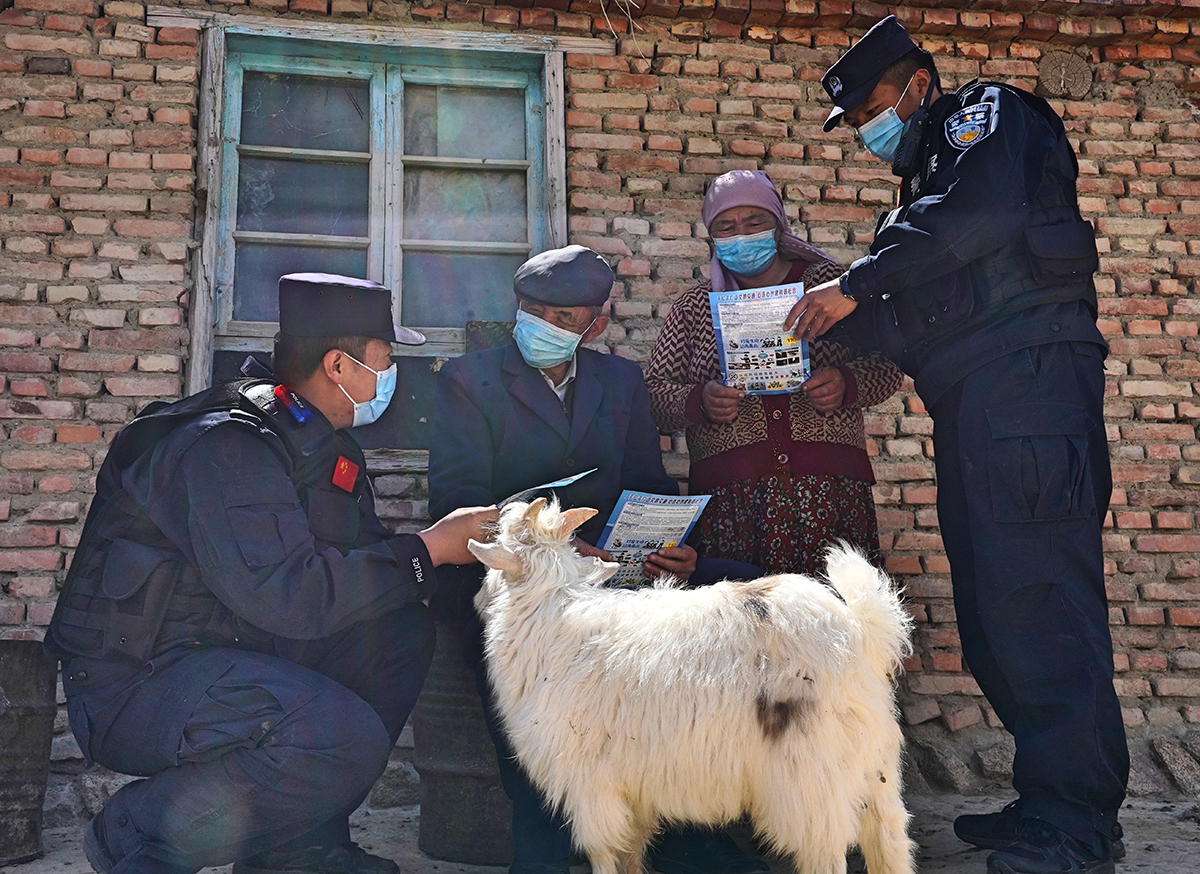 5月31日,新疆昌吉边境管理支队库甫边境派出所组织 “反诈宣传小分队” 在辖区开展防范养老电信诈骗宣传,民警向群众介绍电信诈骗犯罪分子的惯用手法、作案方式等防范养老电信诈骗常识,提升群众对养老电信诈骗的防范意识和能力。图为民警向群众开展防范养老电信诈骗宣传。