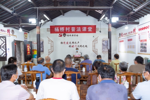 这堂课的主讲人是杨桥村“法治带头人”刘银海,娓娓道来的不仅有杨桥的耕读文化和农作习俗,还有最新的政策、法律。今年以来,杨桥村将本村特色景点与乡村法治建设相结合,利用“法治带头人”“法律明白人”等用村民听得懂的语言开展法治宣传、提供法律咨询、调解矛盾纠纷等,打通了乡村法治建设的“最后一公里”。