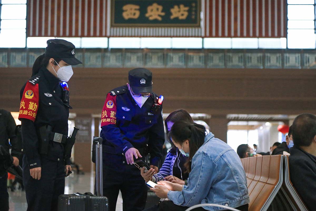 国庆假期期间,西安铁路公安处全面启动高等级勤务,提升辖区车站、列车、线路等重点部位巡防力度,抽调警力进站防控和上车添乘,加强站区交通疏导、安全督导检查和各类隐患排查,及时发现清理各类安全隐患,为广大旅客排忧解难。