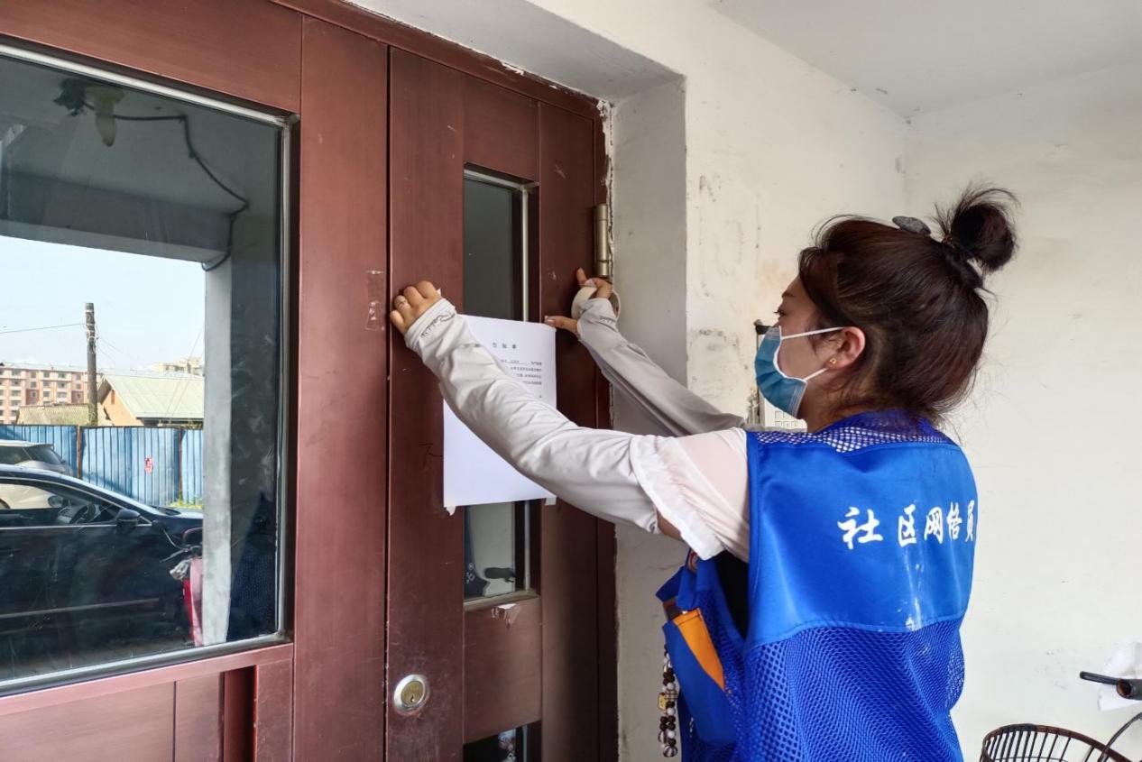 网格员在小区单元门粘贴疫情防控提示