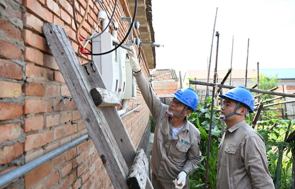 8月17日,在天津市武清区黄花店镇邵七堤村,国网天津电力武清公司工作人员维修设备。新华社记者 孙凡越 摄