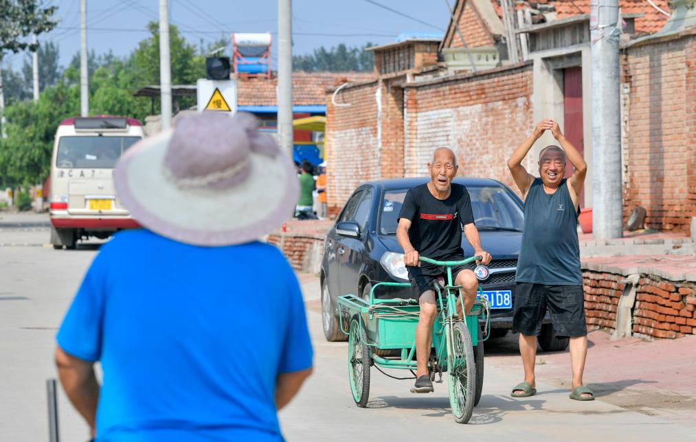 8月17日,在天津市武清区黄花店镇邵七堤村,返村村民相互问候打招呼。新华社记者 孙凡越 摄