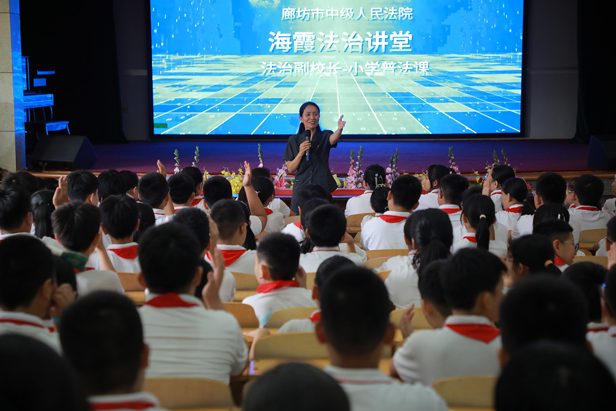 9月6日,河北省廊坊市中级人民法院法治副校长“开学第一课”走进廊坊市第一实验小学。该院未成年人案件综合审判庭庭长、廊坊市第一实验小学法治副校长张海霞携《海霞法治讲堂》系列普法视频,以预防校园欺凌为题进行授课。据了解,《海霞法治讲堂》以法官张海霞为原型,运用数字虚拟技术,合成河北省首个AI法官向未成年人讲授法治课程。