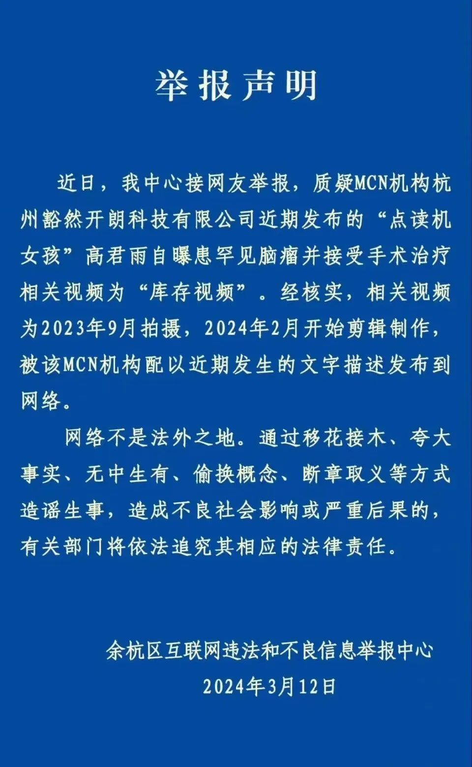 3月12日,涉事MCN机构杭州豁然开朗科技有限公司发布致歉声明称,文案的时间表述出现严重纰漏,从未进行过捐款、打赏等盈利性操作。网民对此说法并不认可,事件持续发酵。当日,杭州市余杭区互联网违法和不良信息举报中心通报称,经核实,相关视频为2023年9月拍摄,2024年2月开始剪辑制作,被MCN机构配以近期发生的文字描述发布到网络,有关部门将依法追究其法律责任。另据潮新闻报道,涉事MCN机构负责人正在接受调查。