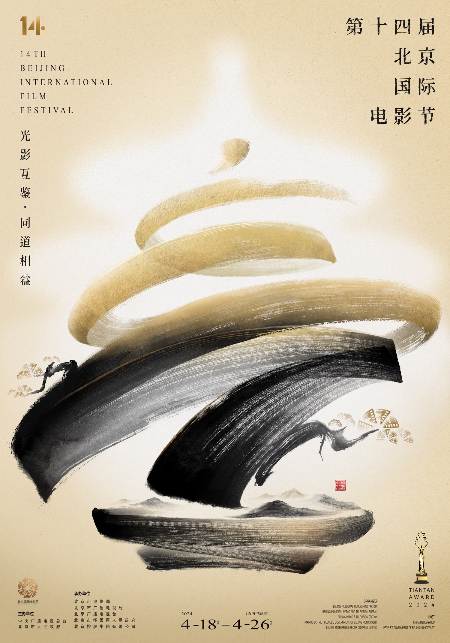 发布会上还发布了第十四届北京国际电影节海报。海报将天坛祈年殿与松柏盆景的造型合为一体,并融入中国传统水墨画风格,将北京国际电影节“天人合一,美美与共”的价值理念贯穿于线条的行云流水之间,蕴藏在墨色的明暗深浅之中。