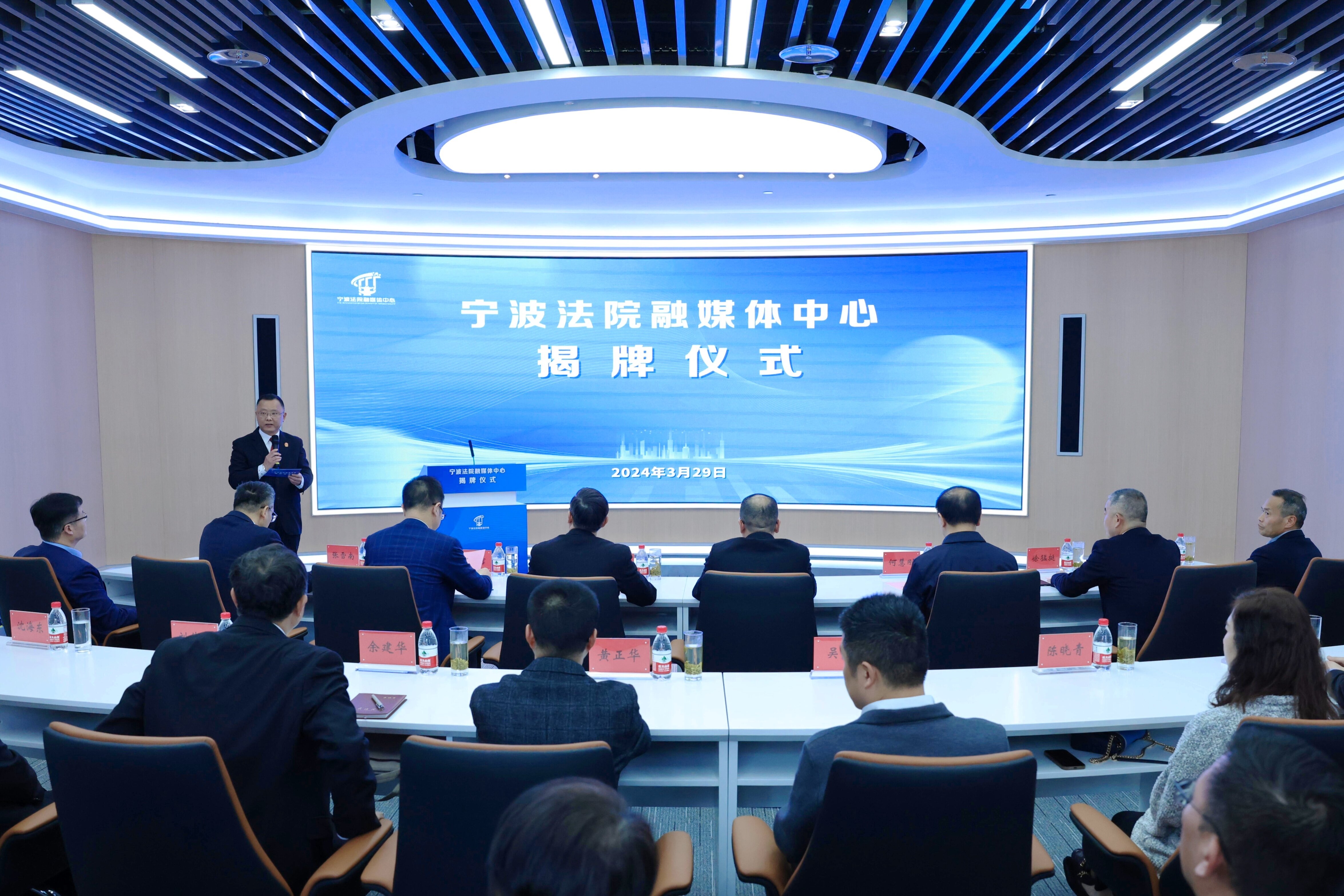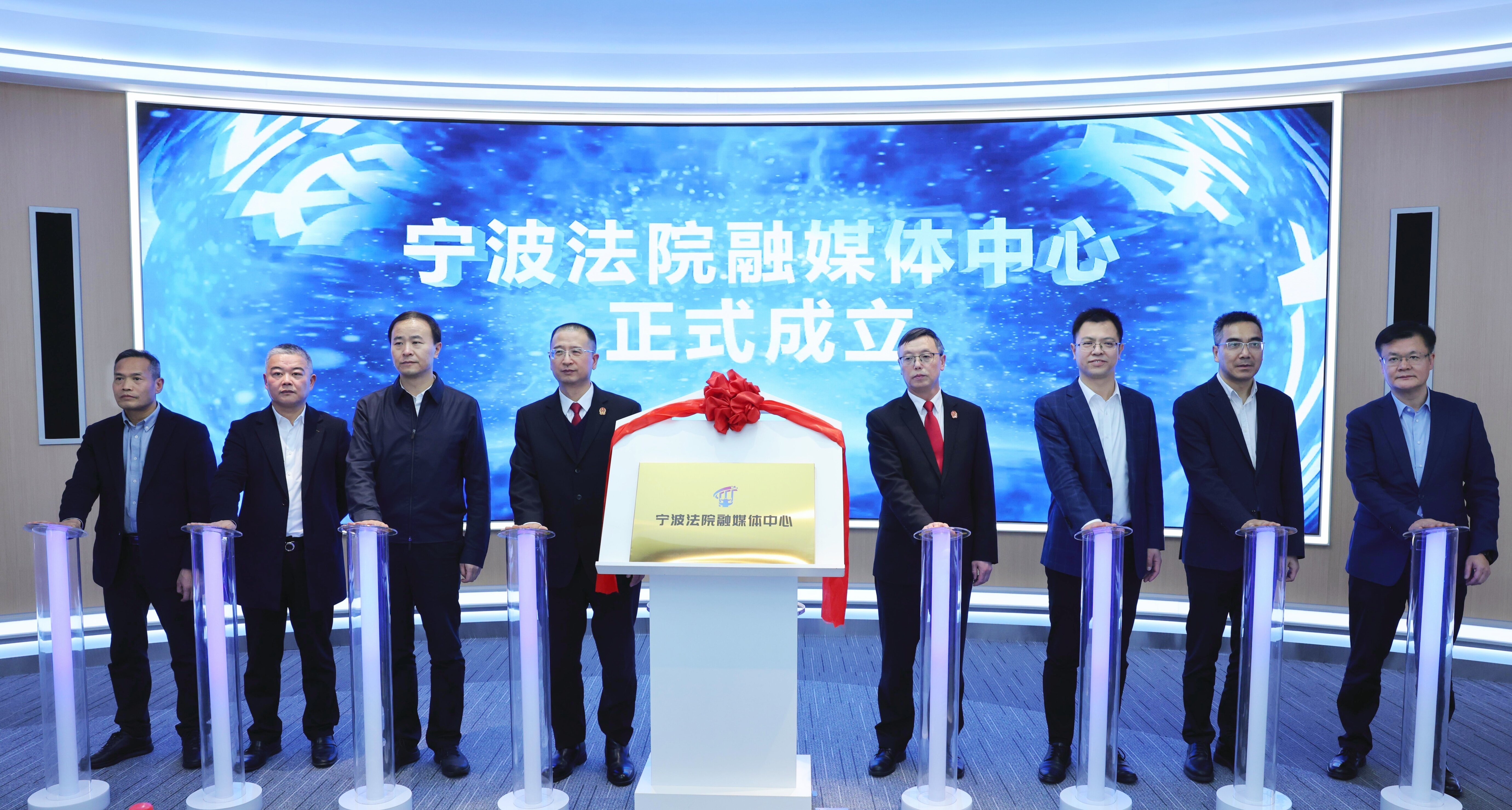 浙江高院党组成员、副院长许惠春,宁波中院党组书记、院长唐学兵,宁波市委副秘书长、政法委常务副书记何慧刚,宁波市委宣传部副部长(兼)、市委网信办主任林大吉,宁波市政府新闻办副主任徐猛挺,浙报传媒集团公司副总经理、浙法传媒集团总编辑张雪南,宁波日报报业集团党委书记、宁波日报社社长李贵军,宁波广播电视集团总裁、党委书记李可,共同为宁波法院融媒体中心揭牌。