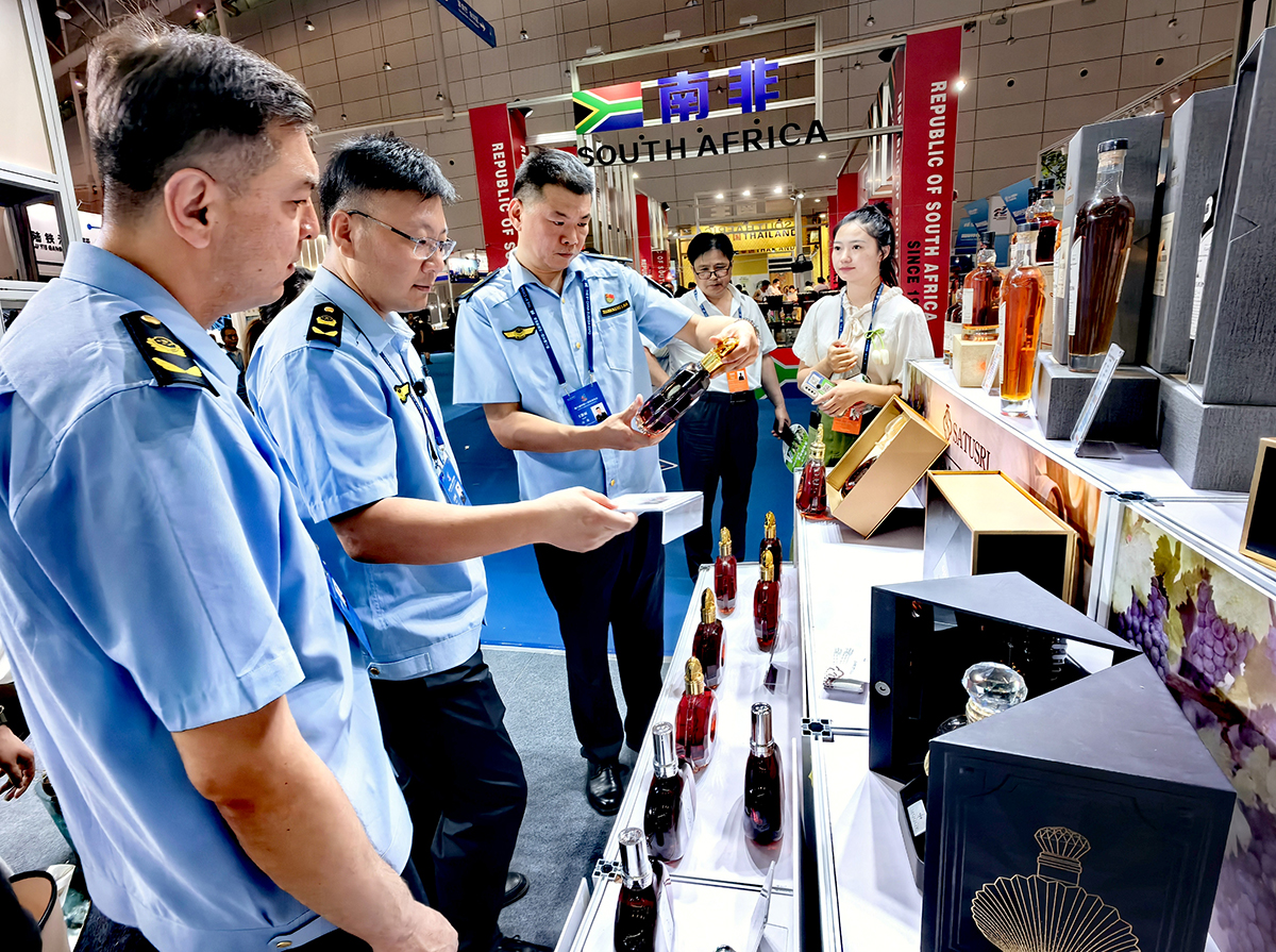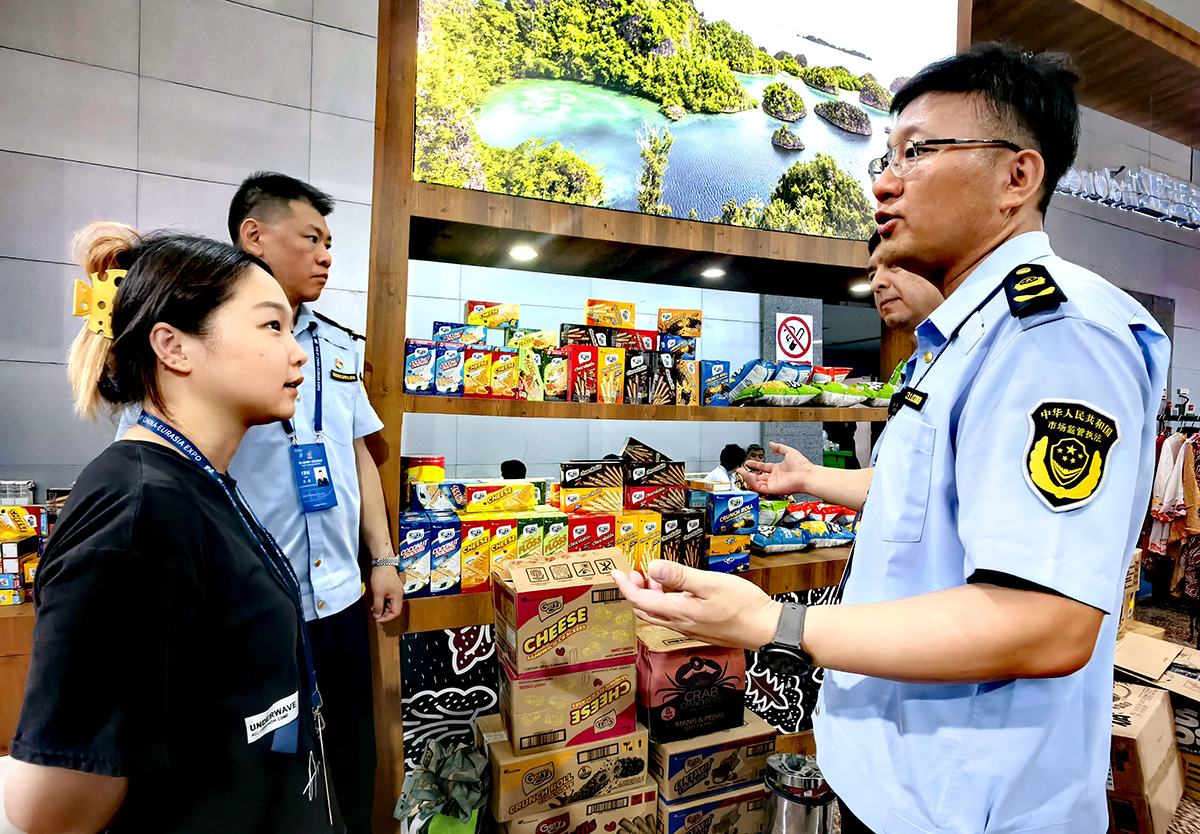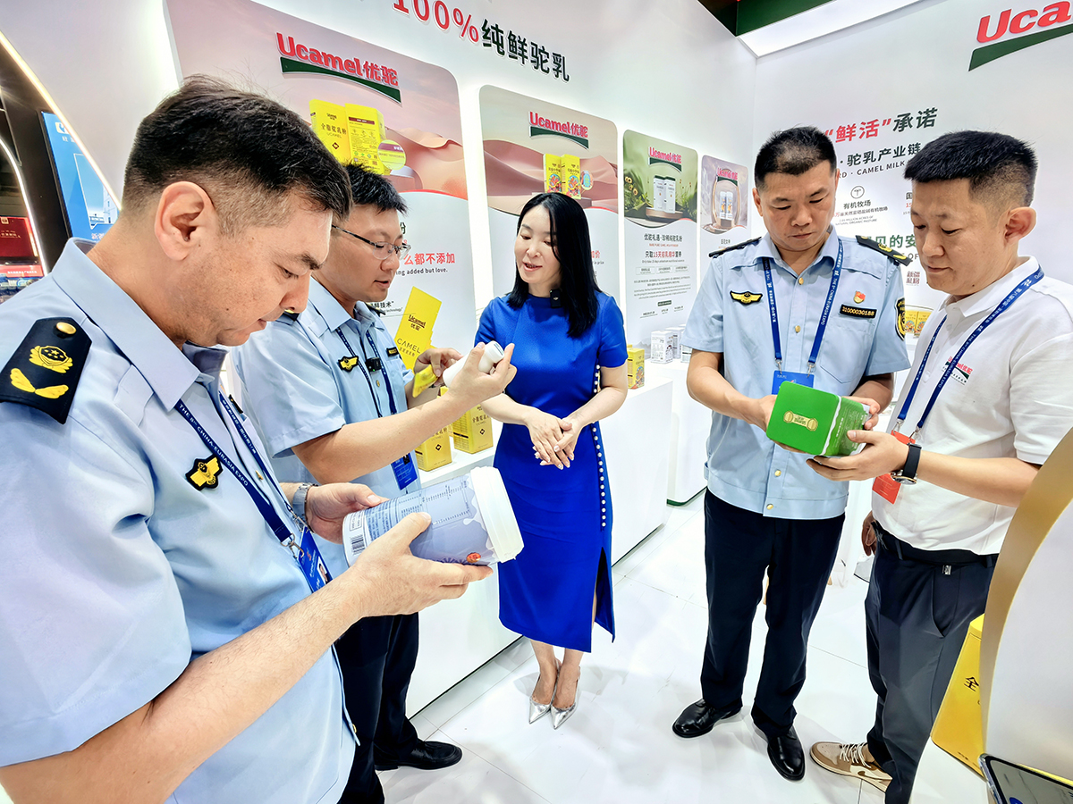 图为6月26日,新疆维吾尔自治区市场监督管理局展会工作站的工作人员正在展馆内对相关参展企业的产品质量进行例行巡查,并开展药品安全、产品质量、工业产品法律法规咨询和12315维权业务咨询服务。