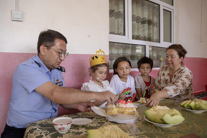 图为新疆伽师县公安局米夏派出所教导员艾尼瓦尔·艾尔肯给留守儿童过生日。 高坤 摄