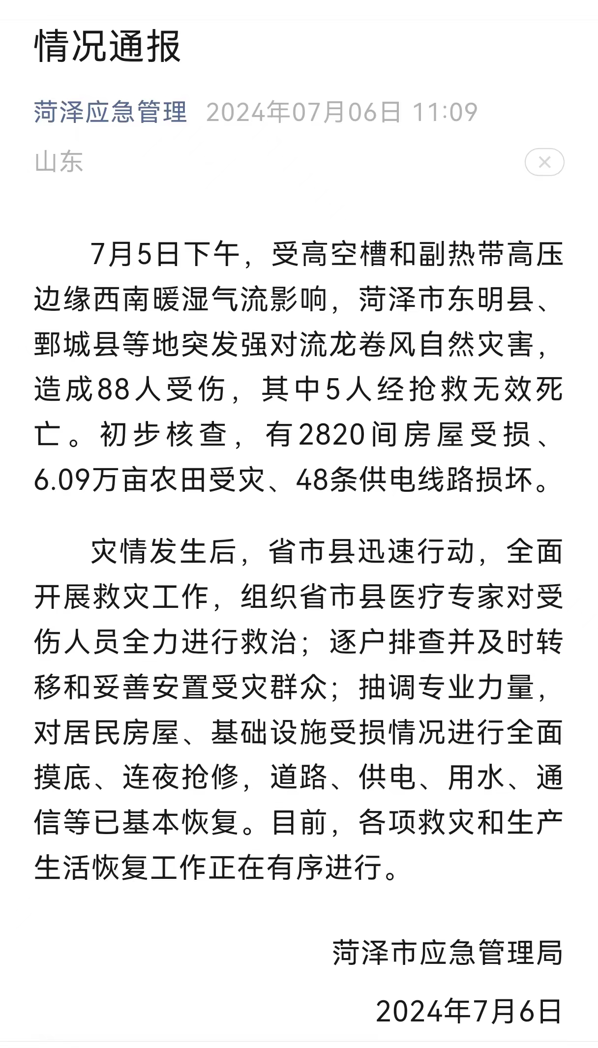 7月6日,记者从山东省菏泽市应急管理局发布的情况通报了解到,7月5日下午,受高空槽和副热带高压边缘西南暖湿气流影响,菏泽市东明县、鄄城县等地突发强对流龙卷风自然灾害,造成88人受伤,其中5人经抢救无效死亡。初步核查,有2820间房屋受损、6.09万亩农田受灾、48条供电线路损坏。