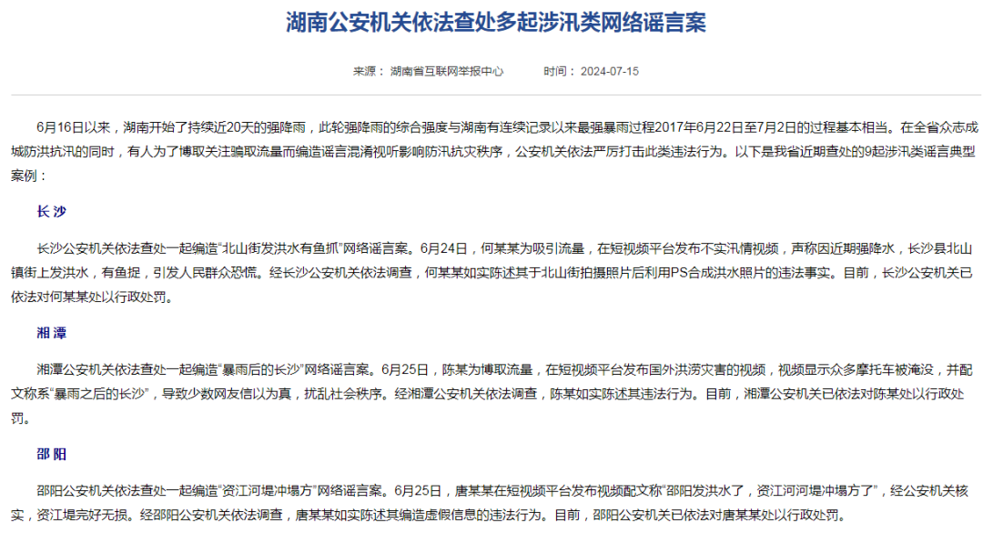 二是夸大灾情险情。此类谣言主要通过捏造数据、刻画细节、绑架“官方”等伎俩,夸大灾情险情,增强谣言的“可信度”。较为常见的是利用耸人听闻的伤亡数据捏造受灾严重的假象,招致人心惶惶。如湖南暴雨期间,常德市一网民在短视频平台发布居住地附近涨水视频,编造称“俺这里天天下雨,天天死人,半个月,三四十个人”,浏览量迅速破10万次,遭到行政处罚;平江县一网民在微信平台造谣称“很多尸体随汨罗江被冲走,3万多人不见了”被行政拘留。四川暴雨期间,曾某某在抖音平台编造“达州洪灾致4人死亡1人失联”虚假信息被行政处罚等。再者,谣言详细说明灾害时间、地点及经过等,给人一种如临现场之感,难辨真假。如账号“正能量实事说事”谎称“岳阳市君山区许市镇的堤防突然决口,洪水倾泻而入,瞬间淹没大片农田和村庄,数千名群众被洪水围困,消防、武警等救援力量正展开紧急救援”。随着文章在各大社交平台扩散,恐慌情绪蔓延至线下,一些商家趁机哄抬物价,部分家庭甚至开始准备撤离。还有网民模仿权威发布,使用“严峻”“危急”等标题,煽动恐慌情绪。如广西桂林遭遇超历史纪录洪水,抖音网民“土豆炒马铃薯”发布一则“情况紧急的新闻通知”造谣称“接到上级电话,平乐县新田水库塌了”,引发不知情的网民留言追问情况。
