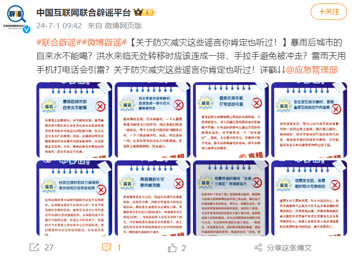 四是涉防灾减灾的“伪科学”信息。此类谣言几乎年年出现,可谓是“老掉牙”谣言,历经反复辟谣仍表现出较强的生命力,甚至还有个别网民以“亲身经历”佐证谣言“属实”。如“暴雨过后城市的自来水不能喝”“雷雨天不能打手机”等相关话题近期登上微博、百度、抖音等平台的热搜榜,有网民跟评称:“我们这里雷电打电话的被雷劈死好几个,那是什么原因呢?”