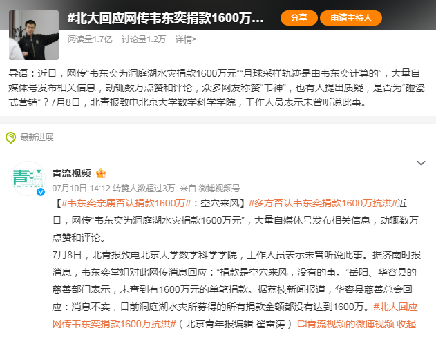 三是捏造救援救助信息。灾害发生后,物资调拨、人员搜救、群众转移等抢险救援情况被主流媒体持续报道,吸引舆论广泛关注,相关谣言趁机流窜,成为传播主旋律中的杂音。如抖音网民“宾利xx”发视频谎称,河南南阳市卧龙区陆营镇王庄村被水淹,卧龙区使用直升机进行救援。经核实,“直升机救援”一说系虚假信息。网传“韦东奕(韦神)为洞庭湖水灾捐款1600万元”消息引发关注,多个相关视频获得数万点赞。事后,韦东奕亲属回应称系“假消息”,湖南岳阳市和华容县慈善部门也表示,未查到有1600万元的单笔捐款。自媒体这种无底线的“碰瓷式营销”激起舆论公愤,《新华每日电讯》发文称,世上没有所谓的“正能量谣言”,旗帜鲜明地打击各类谣言,铲除造谣传谣的土壤,才是真正的正能量。《北京晚报》刊文评论称,给“韦神”贴金是假,靠造谣捞金是真,任短视频谣言隔三岔五污染视听,会对整个社会信任体系造成冲击。