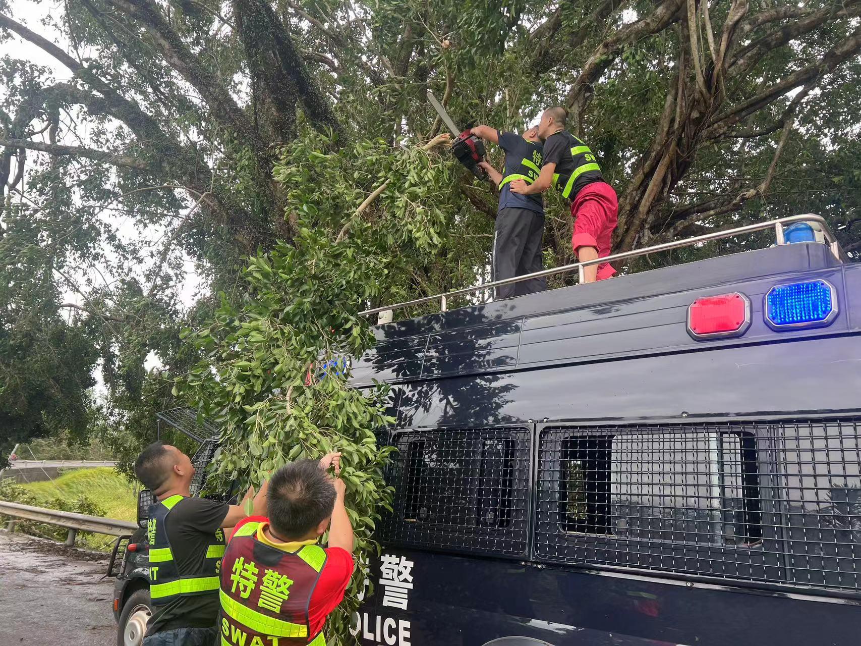 在现场,公安交警有的挥动电锯切割树干,有的则合力搬运树枝,确保道路尽快恢复通行能力。经过连夜奋战,主要道路上的树木障碍被一一清除,交通状况得到显著改善。同时,重点对散落一地的护栏复位加固,为过往车辆和行人提供坚实的安全屏障。