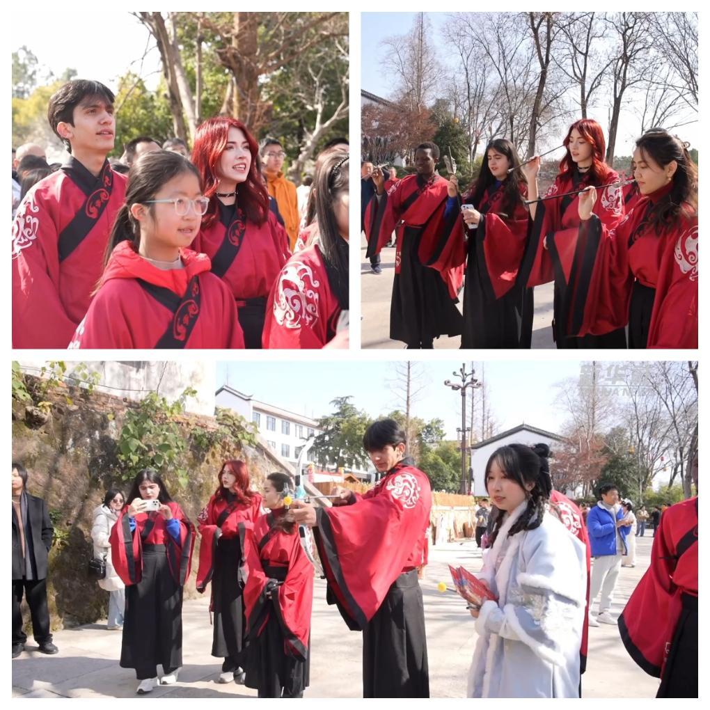 春节期间,来自浙江师范大学的10多位留学生在浙江金华参加了“我在中国过春节”的体验项目。他们身着汉服,到金华府文庙,向孔子像行拜师礼,并在新年祈福牌上书写新年愿景。