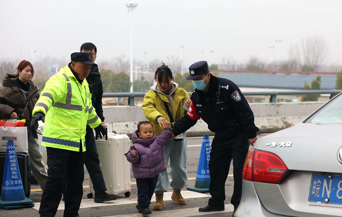 2月3日,安徽省舒城县高铁东站迎来返程高峰。舒城县公安局千人桥派出所高铁东站警务站民警辅警在入站口平台疏导交通、服务群众,确保返程旅客平安出行。