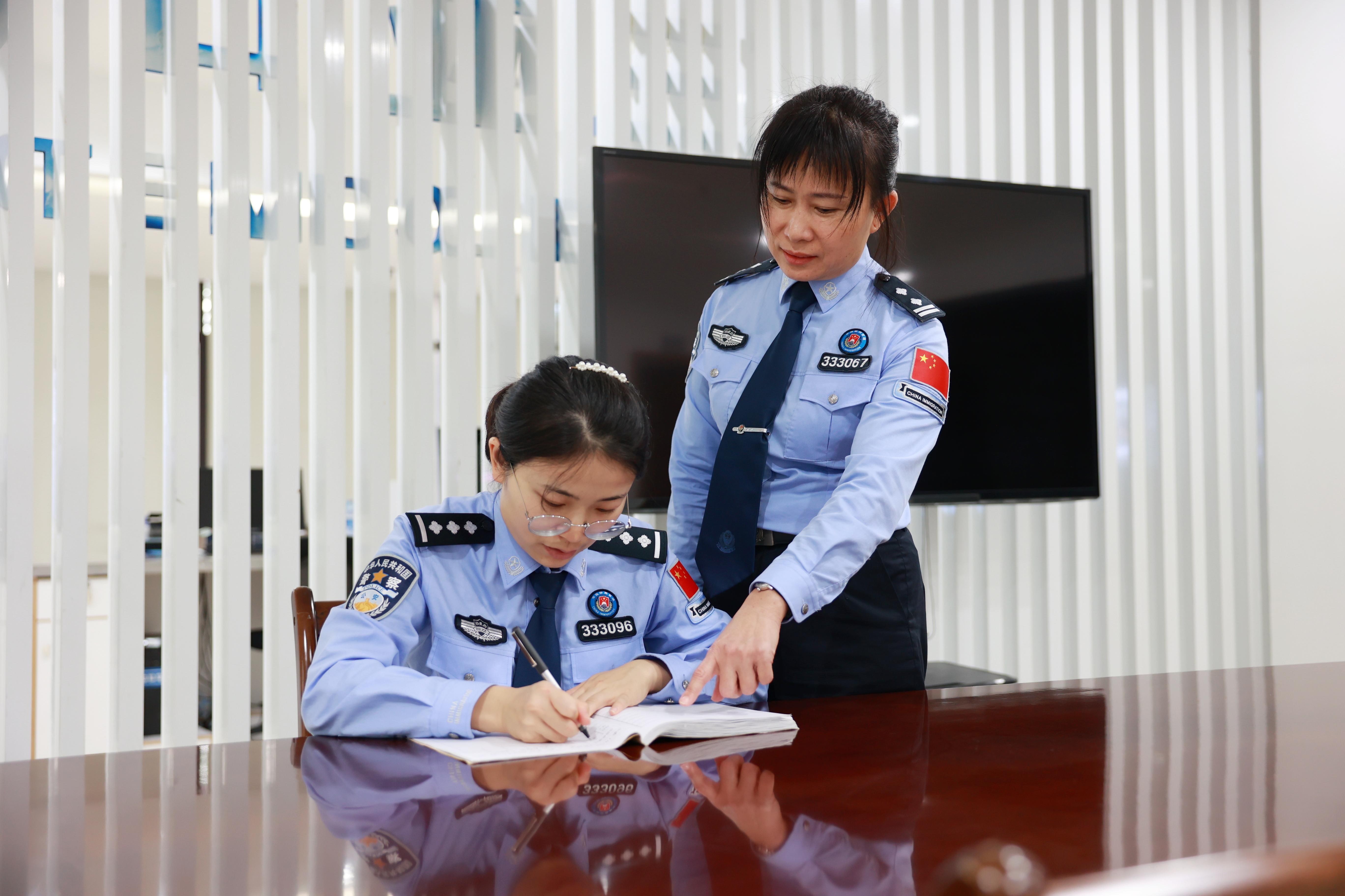 图为三亚边检站执勤一队民警符免纳春节期间坚守在口岸执勤一线帮扶新民警。