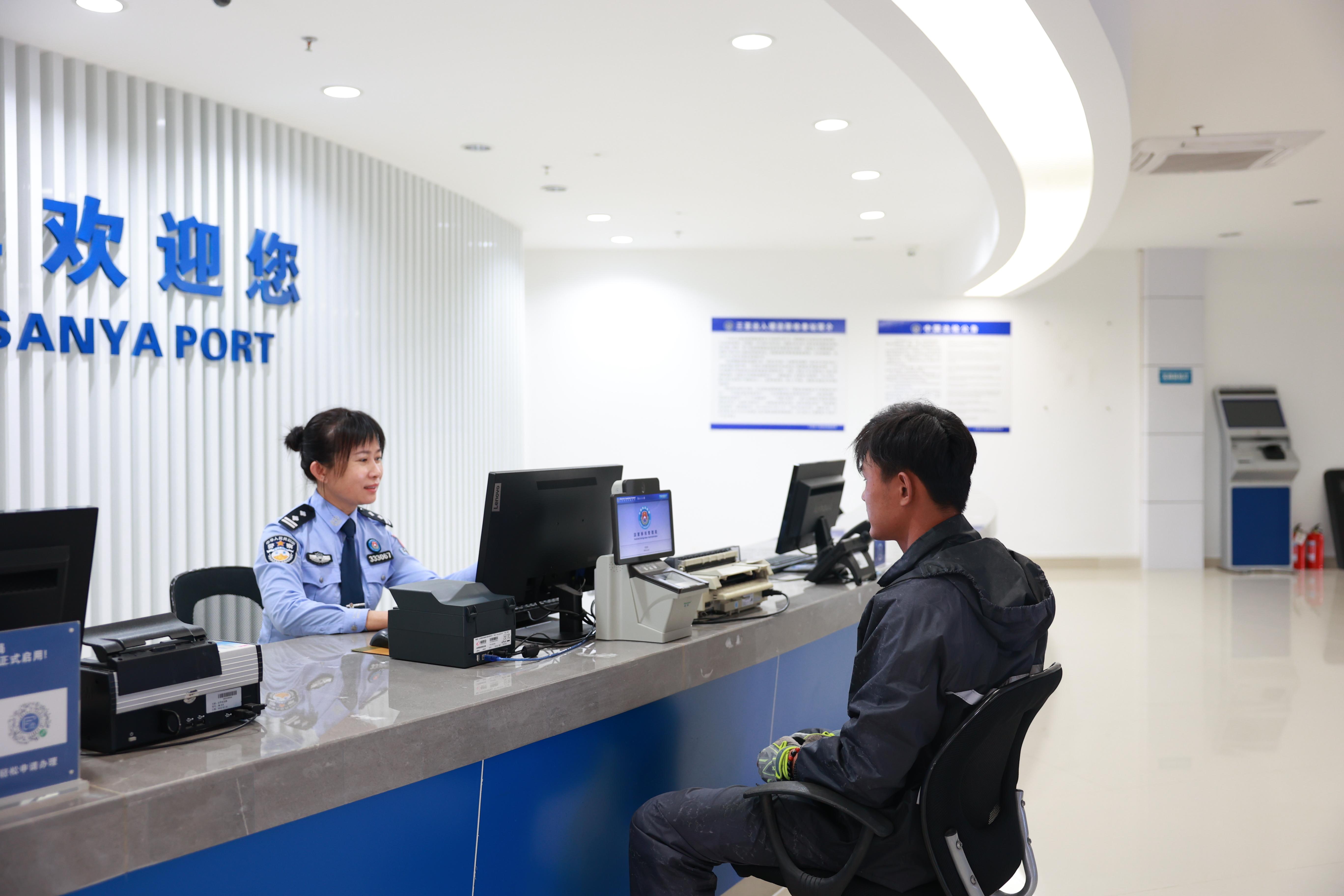 “您好,手续已办好,请收好您的证件,新年快乐!”春节期间,三亚鸿洲国际游艇码头出入境联检大厅人头攒动,旅客们正有序排队候检,在前台办检的是三亚边检站执勤一队民警符免纳,仍坚守在口岸执勤一线。