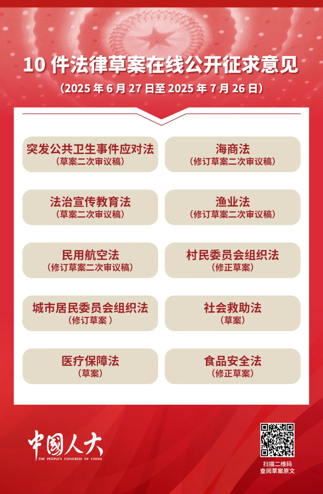 今天起,10件法律草案公开征求意见,截止日期为2025年7月26日。