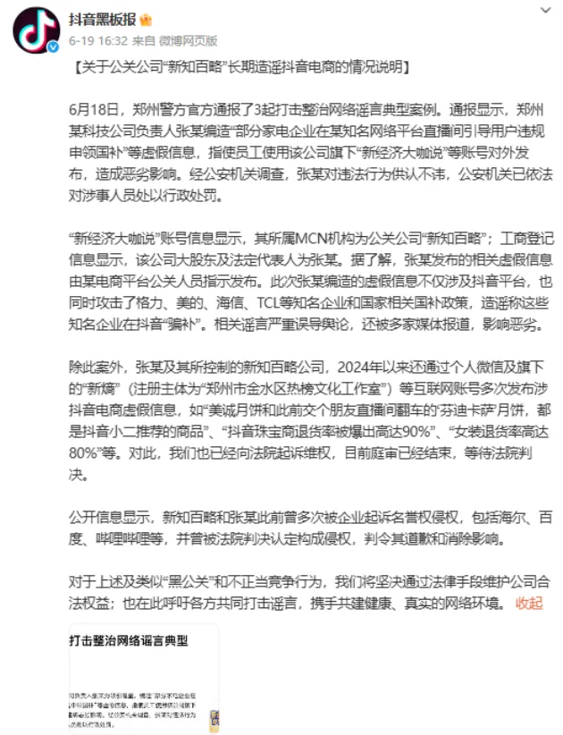 次日,抖音黑板报发布情况说明,指出警方通报中的公关公司为新知百略,其负责人张某此次编造的虚假信息涉及抖音,同时攻击了格力、美的、海信、TCL等知名企业和国家相关国补政策,造谣称这些知名企业在抖音“骗补”。相关谣言严重误导舆论,还被多家媒体报道,影响恶劣。