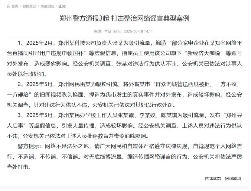 2025年2月,郑州某科技公司负责人张某为吸引流量,编造“部分家电企业在某知名网络平台直播间引导用户违规申领国补”等虚假信息,指使员工使用该公司旗下“新经济大咖说”等账号对外发布,造成恶劣影响。经公安机关调查,张某对违法行为供认不讳,公安机关已依法对涉事人员处以行政处罚,“618”当天,郑州警方对此进行了公开通报。